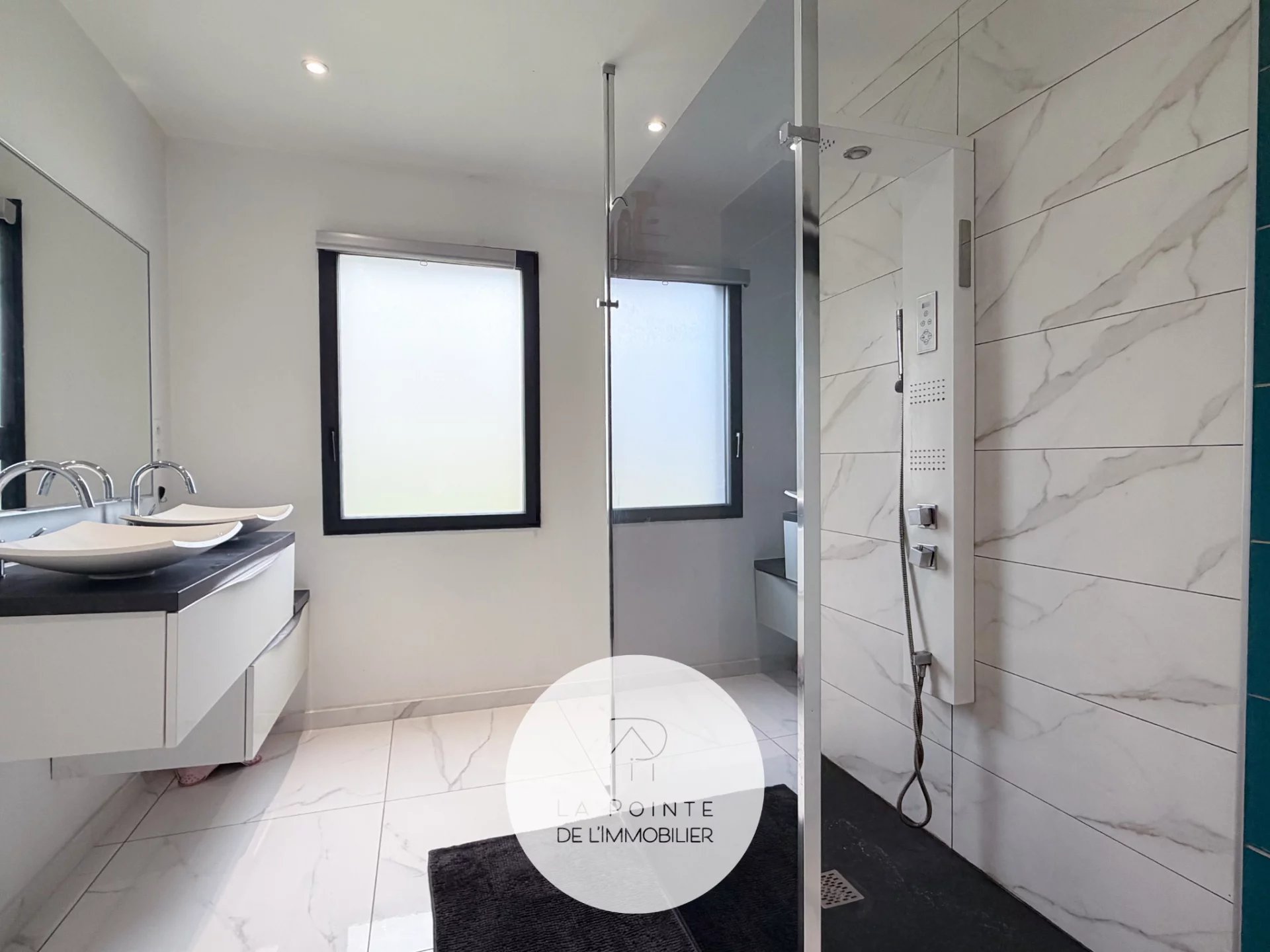 Une salle d’eau complémentaire avec double vasque, douche et sanitaires est proposée. A noter, la présence d’un deuxième sanitaire, lui, indépendant.