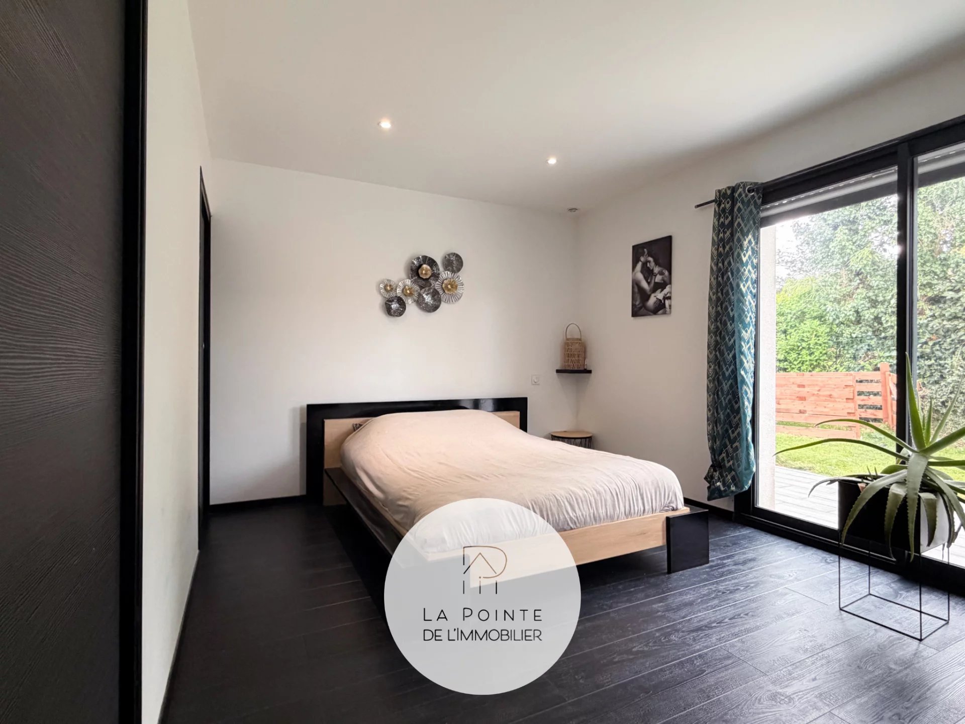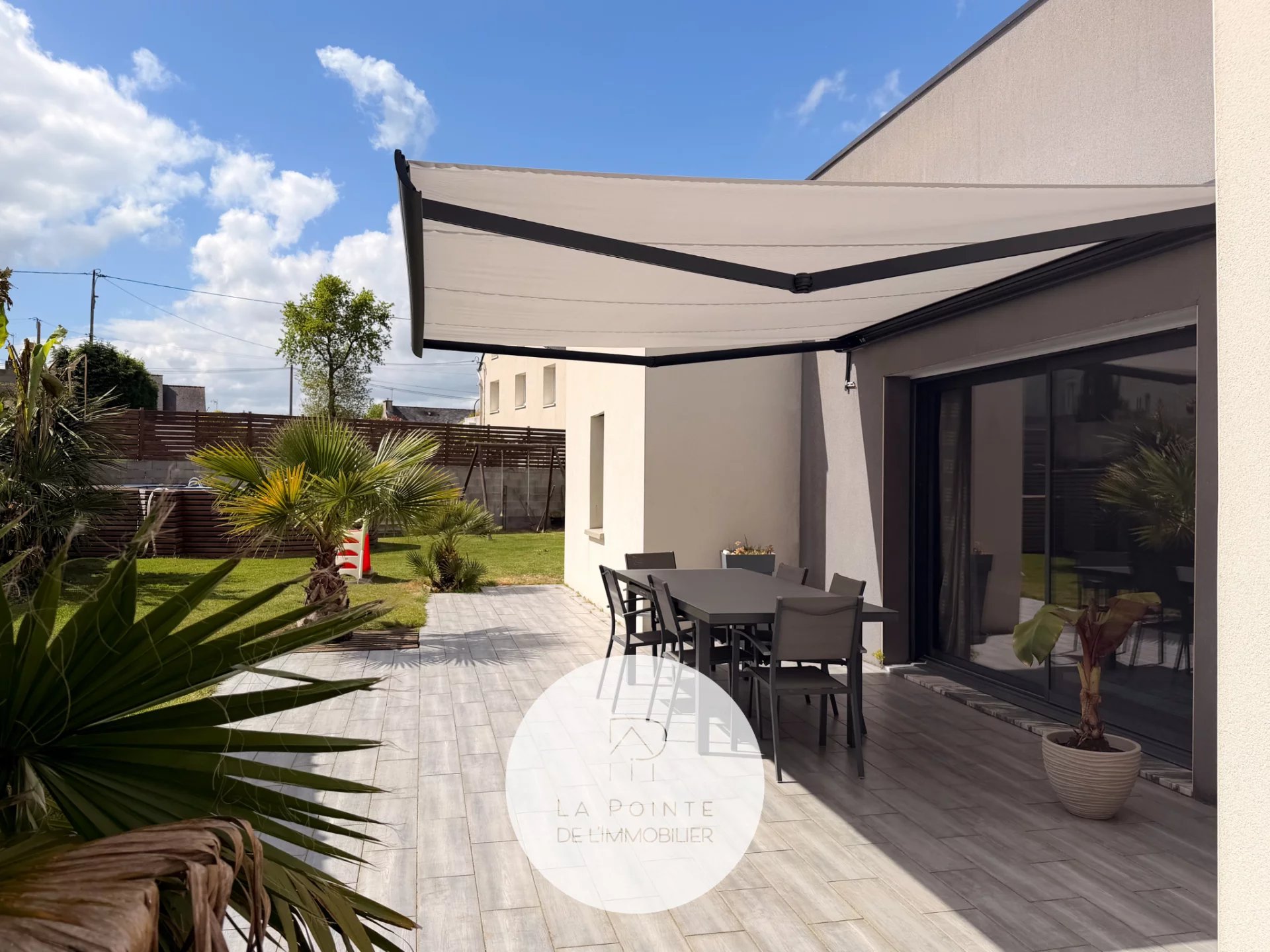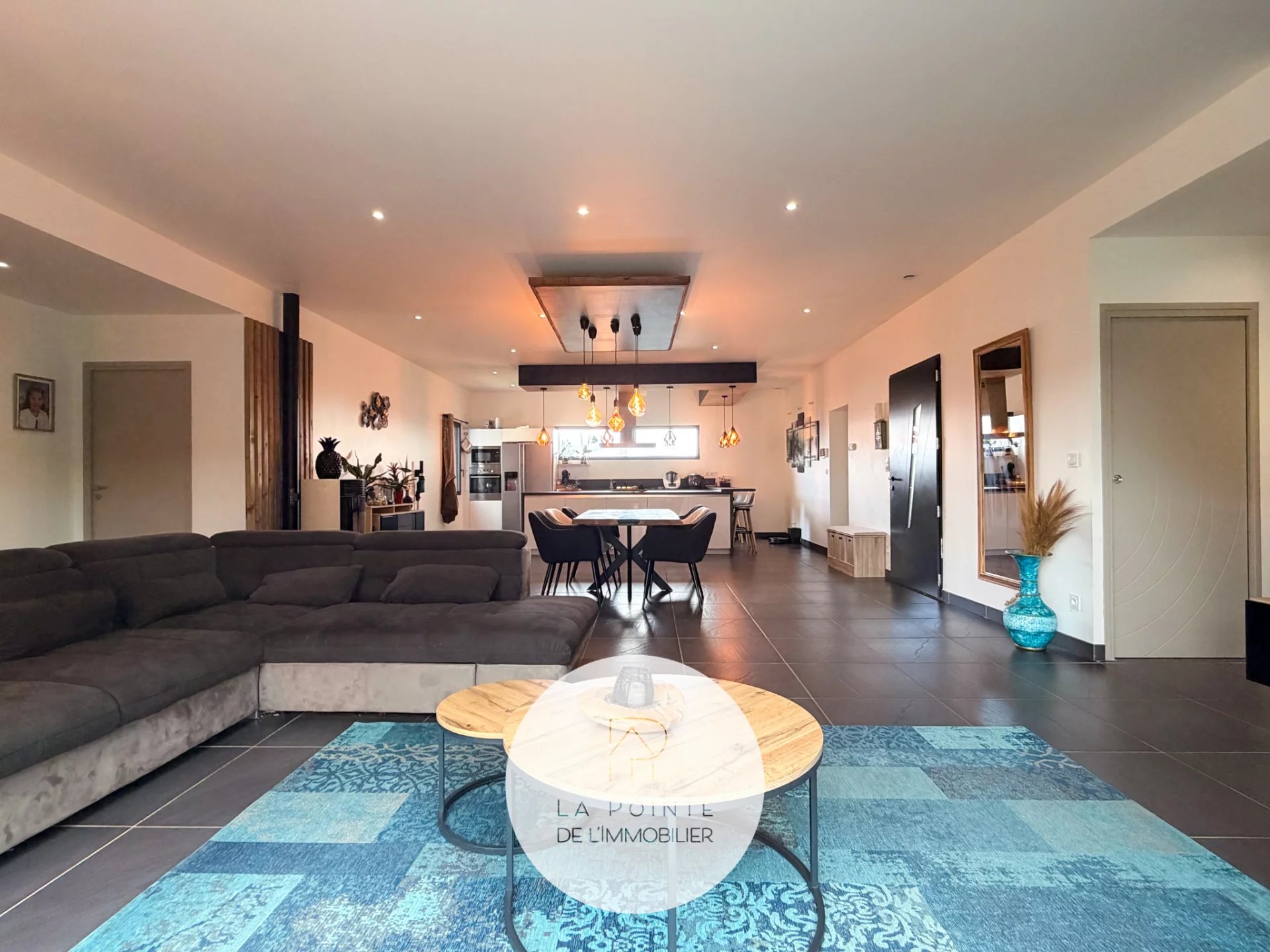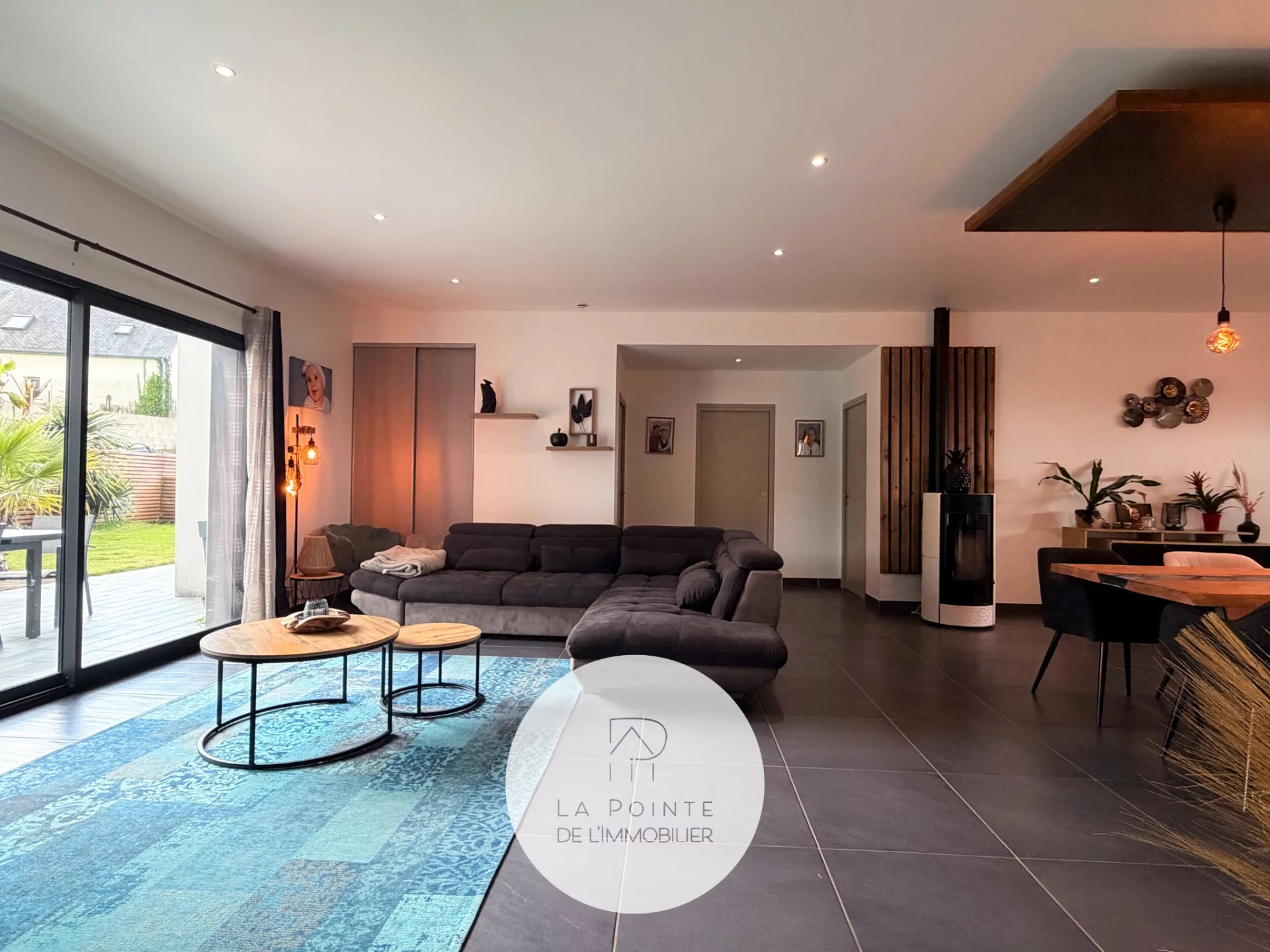 La pièce de vie principale bénéficie de larges baies vitrées coulissantes, permettant un accès direct à l’extérieur et une luminosité optimale toute la journée. L’agencement fonctionne parfaitement pour la vie de famille et la réception d’invités.