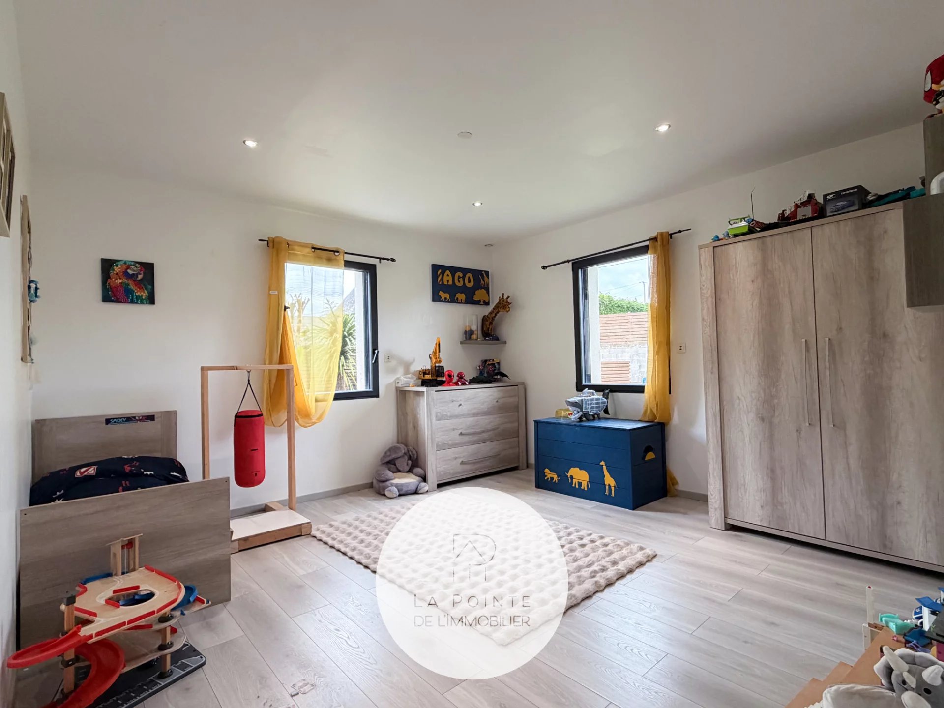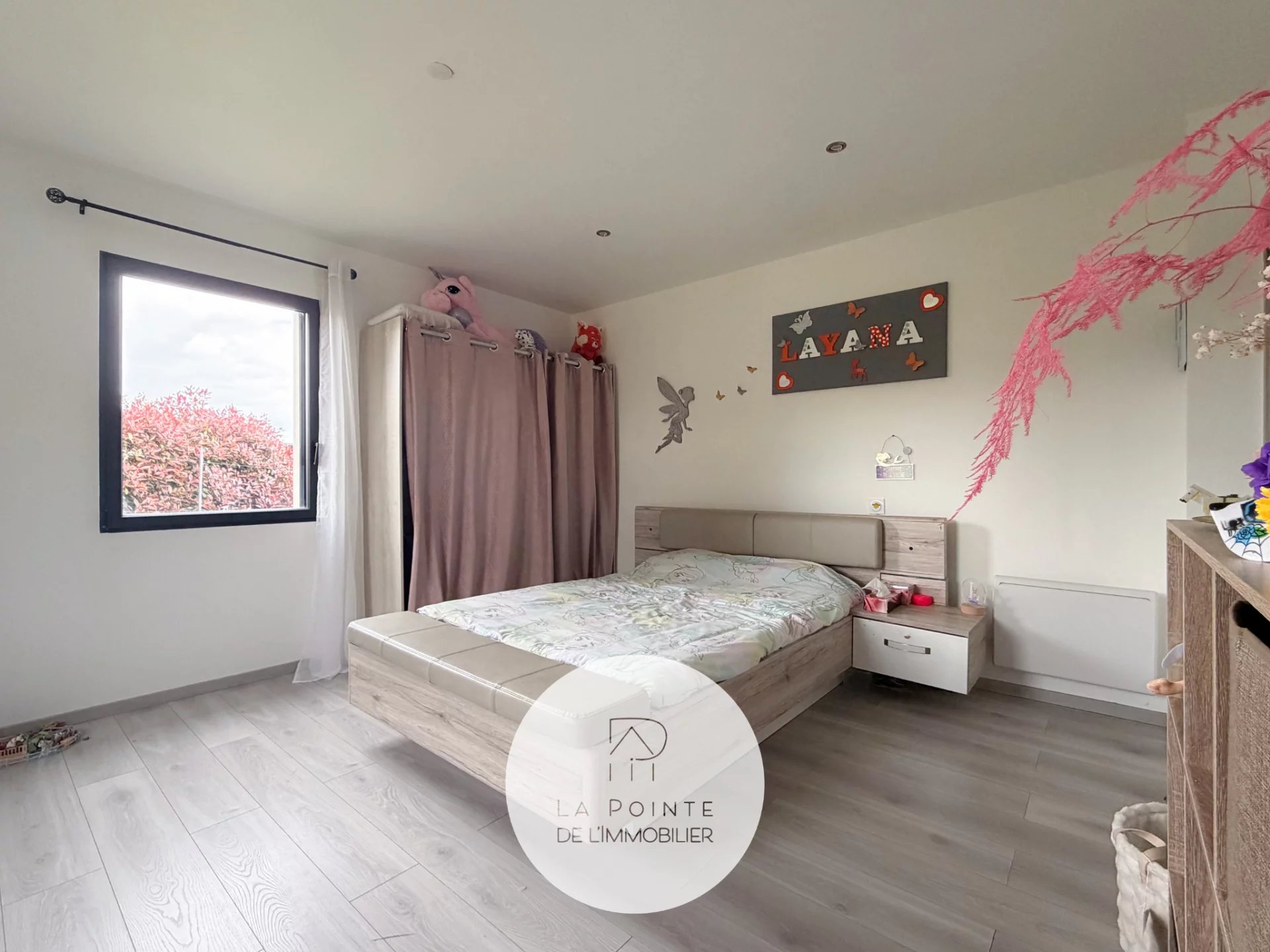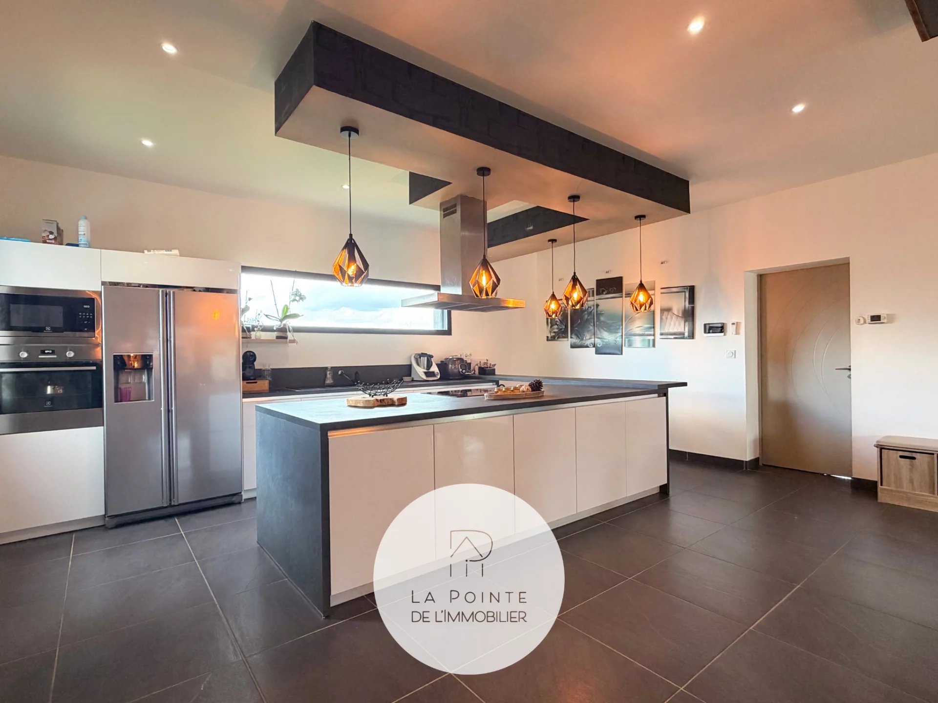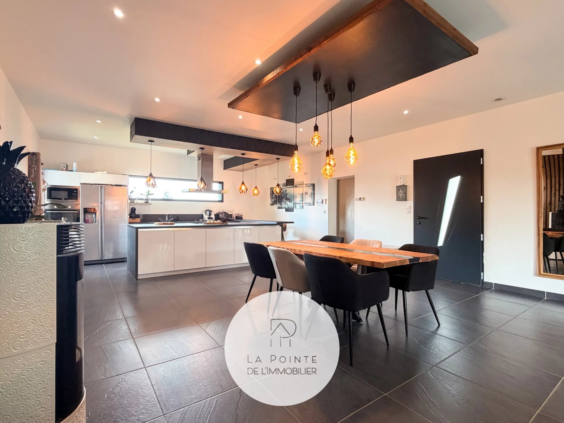La pièce de vie principale bénéficie de larges baies vitrées coulissantes, permettant un accès direct à l’extérieur et une luminosité optimale toute la journée. L’agencement fonctionne parfaitement pour la vie de famille et la réception d’invités.